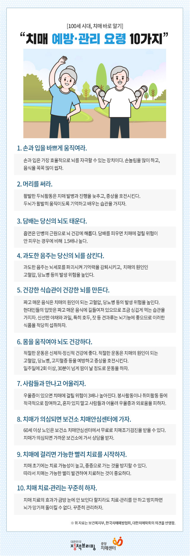 치매는 발병 위험성을 높일 수 있는 인자들을 미리 조절함으로써 치매에 걸릴 확률을 줄일 수 있다.