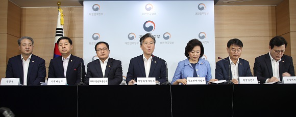 성윤모 산업통상자원부 장관이 5일 오전 정부서울청사 브리핑룸에서 대외의존형 산업구조 탈피를 위한 ‘소재·부품·장비 경쟁력 강화대책’을 발표하고 있다. 왼쪽부터 박천규 환경부 차관·구윤철 기획재정부 제2차관·유영민 과학기술정보통신부 장관·성 장관·박영선 중소벤처기업부 장관·윤종인 행정안전부 차관·최종구 금융위원장. ((c) 연합뉴스) |
