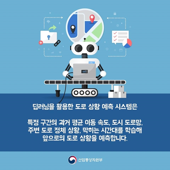 딥러닝을 활용한 도로 상황 예측 시스템은 특정 구간의 과거 평균 이동 속도, 도시 도로망, 주변 도로 정체 상황, 막히는 시간대를 학습해 앞으로의 도로 상황을 예측합니다. 최대 15분 뒤 도로의 차량 이동 속도를 평균 4km 내외의 오차로 예측하고, 도로별 통행 차량 수와 평균 이동 속도를 색과 도형으로 보여줄 수 있어요.