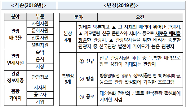 올해부터 ‘한국관광의 별’은 기존의 형태·분야별 시상에서 벗어나 관광자원으로의 매력도와 기여도를 중심으로 본상과 특별상을 시상한다.