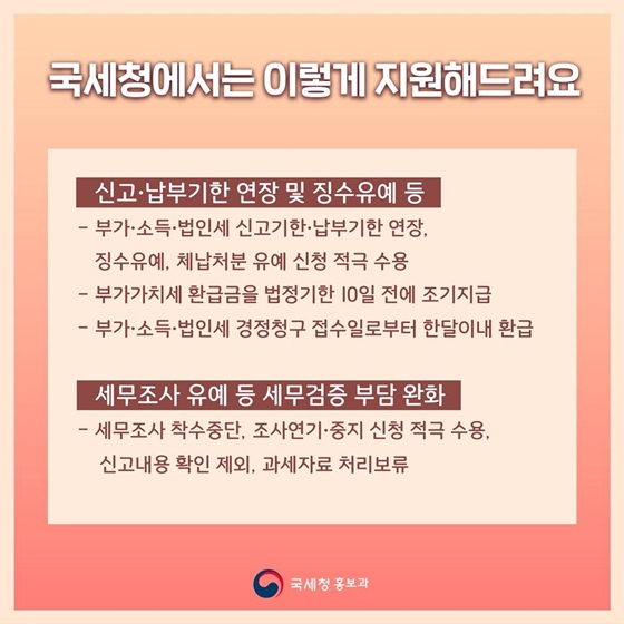 일본 수출규제로 어려움을 겪는 중소기업을 위해 국세청이 ‘일본 수출규제 피해기업 세정지원센터’를 설치하고 적극 세정지원해 드립니다!