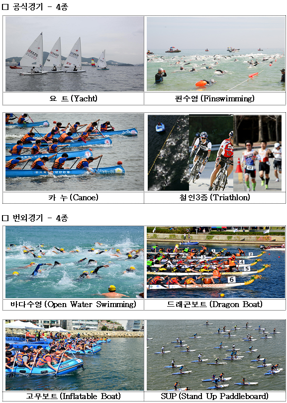 이번 제전에서는 요트·카누·철인3종(트라이애슬론)·핀수영 등 4종의 공식경기와 드래곤보트·고무보트·바다수영·SUP보드(스탠드업패들보드) 등 4종의 번외경기가 열린다.