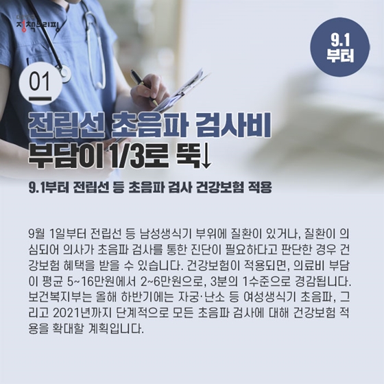 9월 1일부터 전립선 등 남성생식기 부위에 질환이 있거나, 질환이 의심되어 의사가 초음파 검사를 통한 진단이 필요하다고 판단한 경우 건강보험 혜택을 받을 수 있습니다. 건강보험이 적용되면, 의료비 부담이 평균 5~16만원에서 2~6만원으로, 3분의 1수준으로 경감됩니다. 보건복지부는 올해 하반기에는 자궁·난소 등 여성생식기 초음파, 그리고 2021년까지 단계적으로 모든 초음파 검사에 대해 건강보험 적용을 확대할 계획입니다.