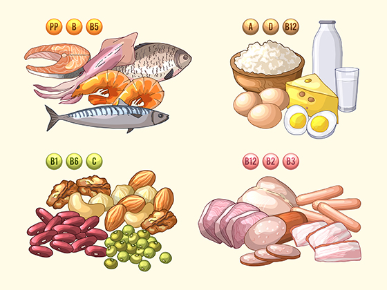 육류의 간, 달걀, 햇빛에 말린 버섯류, 청어, 갈치, 황새치, 연어, 고등어, 정어리 등
