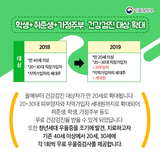 ◆ 학생·취준생·가정주부, 건강검진 대상 확대 올해부터 건강검진 대상자가 만 20세로 확대됩니다. 20~30대 피부양자와 지역가입자 세대원까지로 확대되어, 취준생, 학생, 가정주부 등도 무료 건강검진을 받을 수 있게 되었답니다. 또한 청년세대 우울증을 조기에 발견, 치료하고자 기존 40세 이상에서 20세, 30세에 각 1회씩 무료 우울증 검사를 제공합니다.