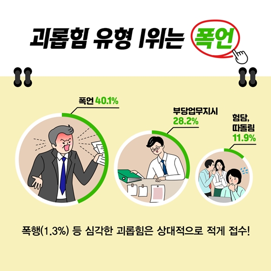 규모가 작은 50인 미만 사업장에서 가장 많이 발생했으며, 체계적인 인사관리가 어려워 괴롭힘이 상대적으로 많이 발생하고 있는 것으로 분석됩니다. 그리고 서비스업종(건물 관리업, 청소업, 경비·경호서비스업, 여행사업 등)에서 상대적으로 많이 발생했습니다.