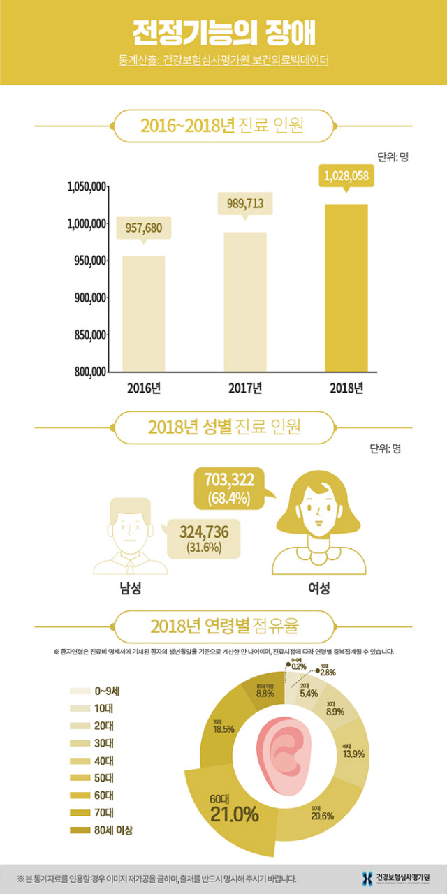 건강보험심사평가원 통계자료에 따르면, 2018년 전정기능의 장애로 진료를 받은 여성 환자는 70만 3322명으로 전체 환자의 약 70%를 차지하는 것으로 조사됐습니다.