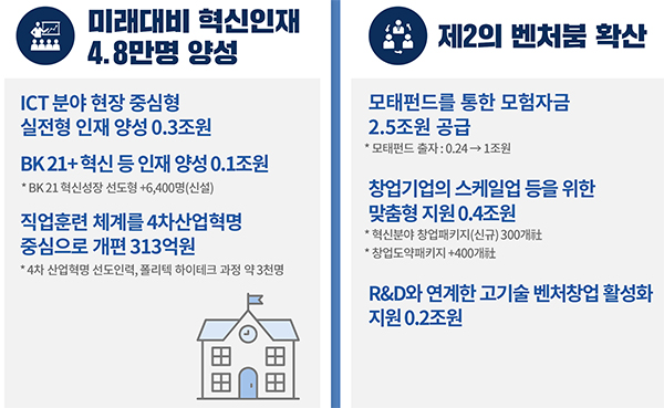 한편 혁신 성장을 주도할 미래형 창의인재 체제 구축을 위해 대학교육 개선에 투자를 확대해 대학혁신 지원 및 인재 양성 프로그램을 늘리고, 지역인재 양성을 위한 국립대학 교육·연구기반을 강화한다.