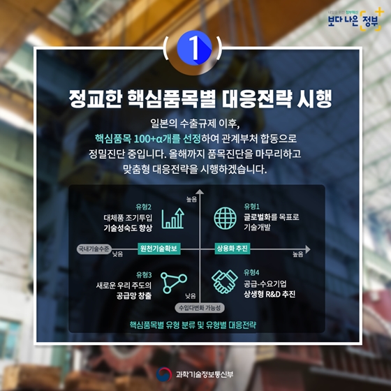 정부는 일본의 수출제한 조치를 국가 R&D 전체의 혁신을 위한 출발점으로 삼아 특정 국가에 대한 대외의존을 탈피하고 국가성장기반을 다지는 기회로 만들겠습니다.