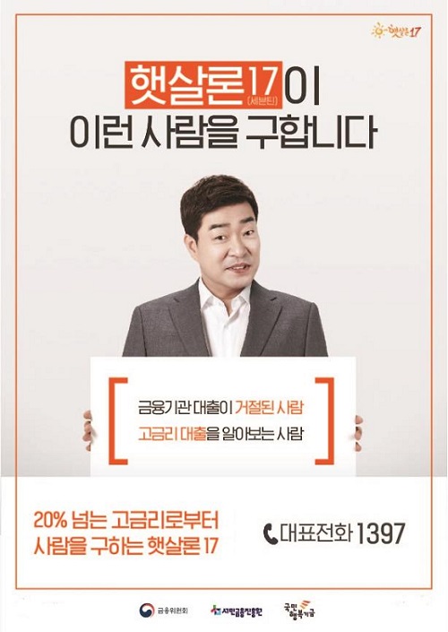 [일간환경연합 신상미 기자ㅣ]신용등급이 낮아 고금리 대출이 불가피한 저신용자들을 위한 대출상품 ‘햇살론 17’이 2일 출시됐다. 이 상품은 전국 13개 시중은행과 47개 서민금융통합지원센터를 통해 상담과 이용이 가능하다.