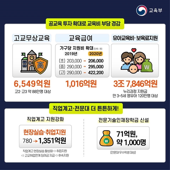 [일간환경연합 한선미 기자]교육비 부담은 더 줄이고 교육의 질은 더 높입니다! 국민의 삶이 더 든든해지는 2020년 교육부 예산안 8대 중점사항을 지금 카드뉴스로 알아보세요