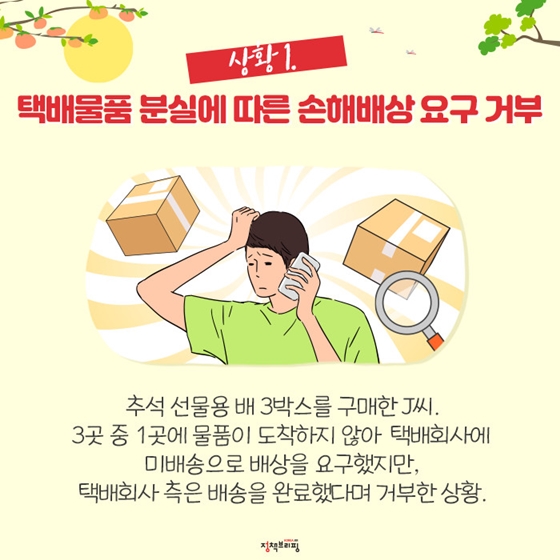 ◆ 상황 1. 택배물품 분실에 따른 손해배상 요구 거부 추석 선물용 배 3박스를 구매한 J씨. 3곳 중 1곳에 물품이 도착하지 않아 택배회사에 미배송으로 배상을 요구했지만, 택배회사 측은 배송을 완료했다며 거부한 상황.