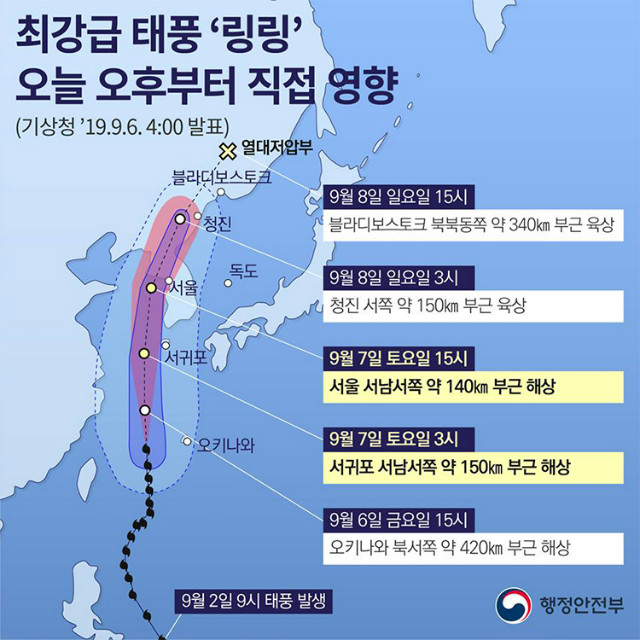 <제13호 태풍 ‘링링’ 이동경로(’19.9.6. 04:00기준)>