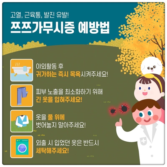 ◆ 추석 연휴 성묘 가서 풀밭 위에 앉았더니, 쯔쯔가무시증?명절 기간 성묘 같은 야외활동 시 진드기를 통해 옮기는 감염병으로 고역, 근육통, 발진 등의 증상이 나타납니다.