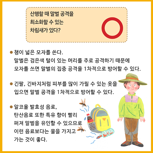야외 활동 때는 되도록 밝은색의 긴 옷과 모자를 착용하고 향수나 화장품을 자제하면 말벌 사고 예방에 도움이 된다.