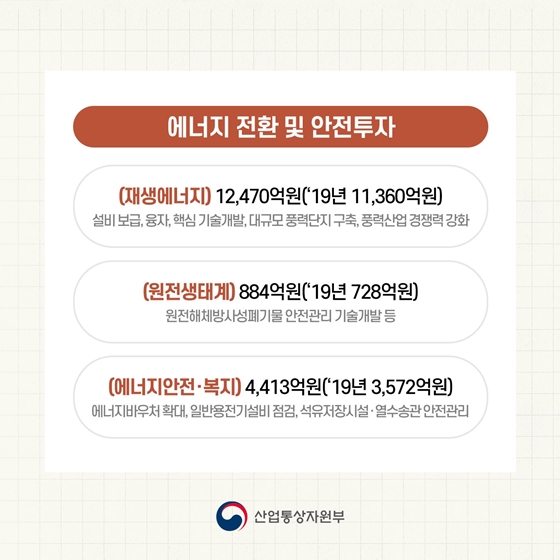 - (에너지안전·복지) 4,413억 원(’19년 3,572억 원)