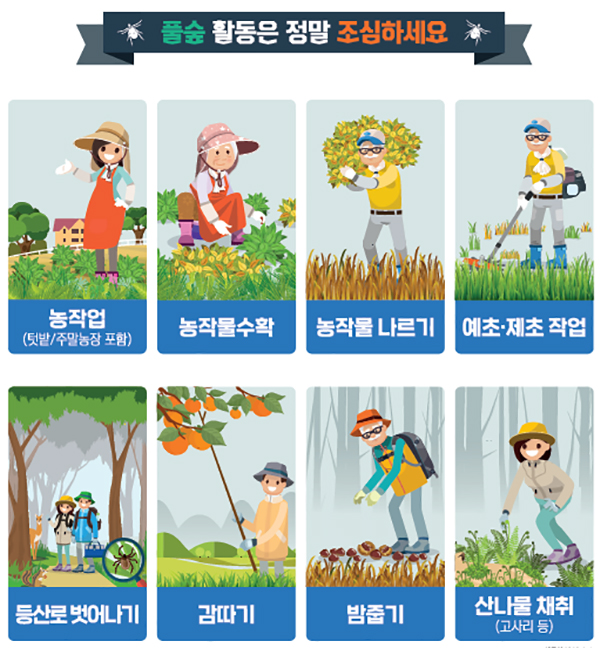 때문에 성묘나 벌초, 농작업 등 야외활동 시 피부 노출을 최소화해 진드기에 물리지 않도록 주의해야 하고, 귀가 즉시 샤워나 목욕을 하는 등 예방수칙을 준수해야 한다.