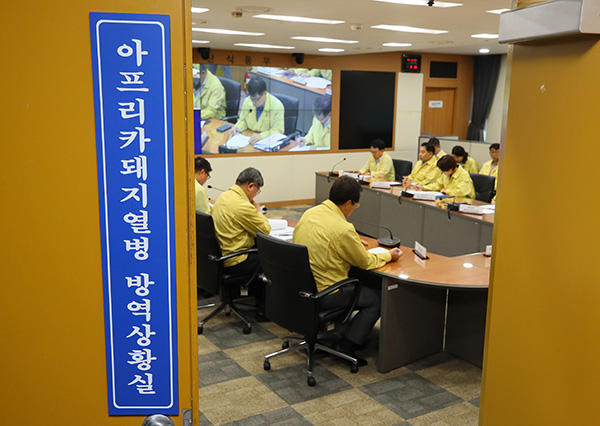 경기 파주와 연천에서 연이어 아프리카돼지열병 확진 판정이 난 18일 세종시 정부세종청사 농림축산식품부 아프리카돼지열병 방역상황실에서 비상회의가 열리고 있다.(사진=(c) 연합뉴스) |
