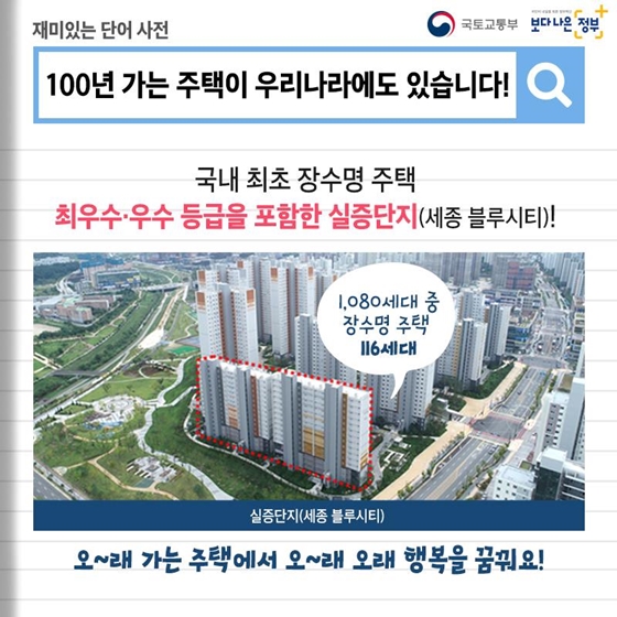 100년 가는 주택이 우리나라에도 있습니다! 국내 최초 장수명 주택 최우수 우수 등급을 포함한 실증단지 (세종 블루시티)! 오래 가는 주택에서 오래 오래 행복을 꿈꿔요!