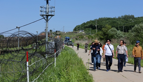 정부는 파주와 연천에서 아프리카돼지열병(ASF)이 발생함에 따라 ‘디엠지(DMZ) 평화의 길’ 파주, 철원 구간의운영을 19일부터 잠정 중단한다고 밝혔다. 사진은 지난 5월 29일 취재진이 강원도 철원군 'DMZ 평화의 길'을 걷고 있다. (사진=(c) 연합뉴스) |