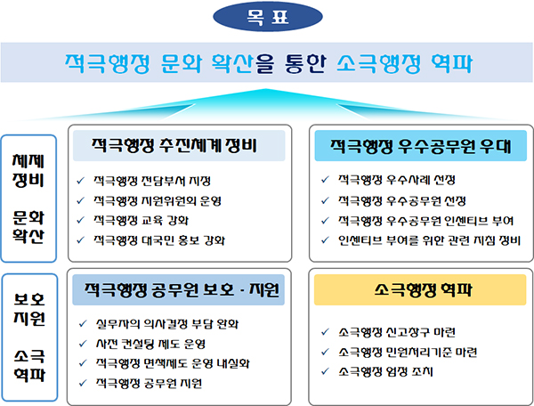 구체적인 실행계획으로는 적극행정 우수공무원에 대한 인센티브와 소송지원, 면책 등 보호제도와 소극행정 공무원에 대한 엄정 조치 등을 포함하면서 적극행정 문화의 조기 정착에 목표를 두었다.