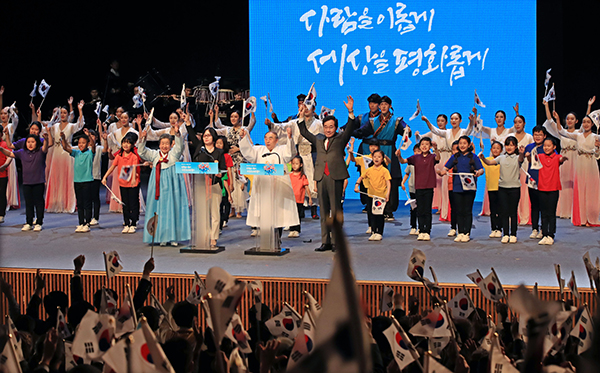이어서 애국가는 국립국악원 창작악단의 연주에 맞추어 의인들과 다문화어린이합창단 등의 선도로 4절까지 다 함께 부른다.