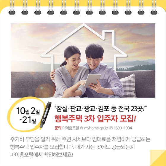 ◆ 전국 23곳 행복주택 3차 입주자 모집! (10.2~21)주거비 부담을 덜기 위해 주변 시세보다 임대료를 저렴하게 공급하는 행복주택 입주자를 모집합니다. 내가 사는 곳에도 공급되는지 마이홈포털에서 확인해보세요!!