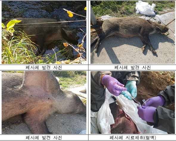 국방부와 환경부, 산림청, 지자체 등 70∼80개로 구성된 ‘민관군합동포획팀’이 15일부터 남방한계선(GOP)과 민통선 구간 내 야생멧돼지 출몰·서식지역에 투입된다. 사진은 야생멧돼지 폐사체 수거지점 및 현장모습.(사진=환경부) |