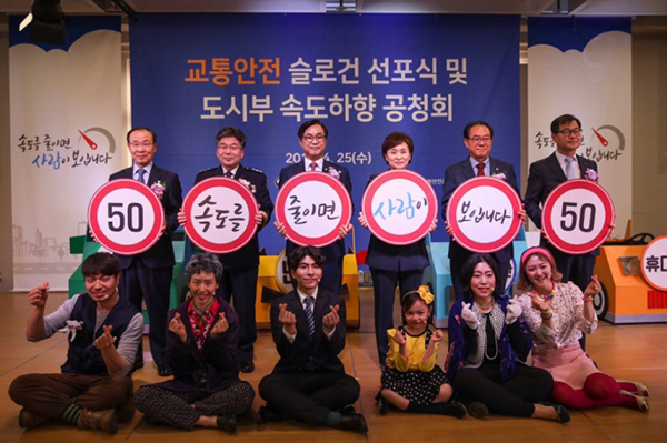지난해 4월 코엑스에서 열린 교통안전 슬로건 선포식 및 도시부 속도하향 공청회에서 참석자들이 슬로건이 적힌 푯말을 들고 기념촬영을 하고 있다. (사진=국토교통부) |