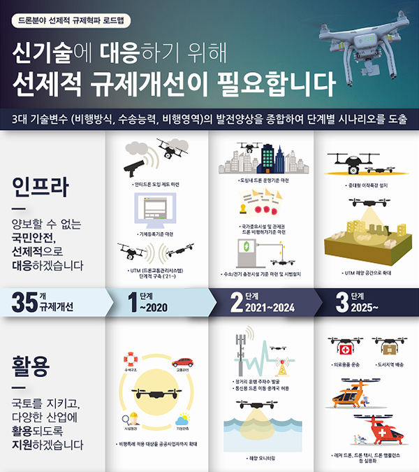 관련 부처와 항공우주연구원, 드론산업진흥협회 등 총 30개 기관이 논의를 거쳐 완성한 로드맵에는 국내 드론 기술·산업 발전 시기에 따라 개선이 필요한 총 35건의 규제가 담겼다. 교통·제도·인프라 관련 규제가 19건, 배송·운송 등 드론 활용 영역 관련 규제가 16건이다.