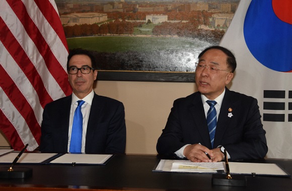 홍 부총리는 지난 5월 자국 통화가치를 인위적으로 평가절하한다고 여겨지는 국가에 대해 미국 정부가 상계관세를 부과하겠다고 밝힌 것이 어떻게 진행되고 있는지 문의했다. 또 무역확장법 232조에 근거한 자동차 관세 부과에 대해 한국을 제외해달라고 요청했다.