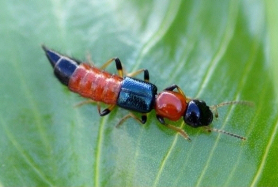 A. ‘화상벌레’라고 알려진 ‘청딱지개미반날개’의 형태는 매우 가늘고 작으며(폭 1㎜, 길이 7~8㎜), 전체적으로 검은색과 붉은색을 띠고, 복부 중간의 딱지 날개는 파란색 또는 초록색의 금속성 광택을 나타냅니다.
