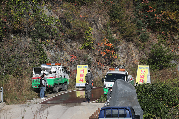 지난 17일 경기도 가평군 북면 연인산에서 열린 아프리카돼지열병(ASF) 확산 방지를 위한 야생멧돼지 합동 포획에서 방역차량이 등산로 입구에서 대기하고 있다.(사진=(c) 연합뉴스) |