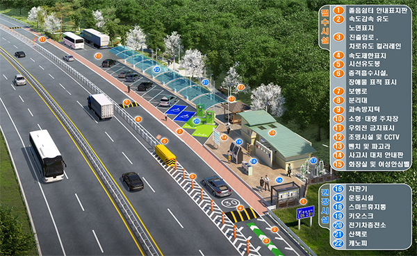 졸음쉼터에는 화장실뿐 아니라 대형차 주차공간, 여성안심벨, 전기차충전소 등 시설도 들어선다.