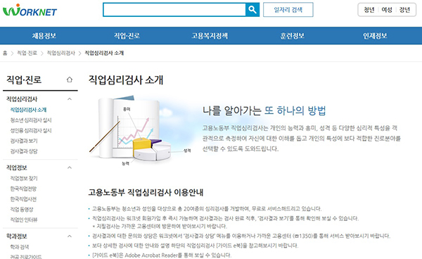 [일간환경연합 신상미 기자]일자리포털 ‘워크넷’에서 청년 취업준비와 진로결정에 도움을 줄 수 있는 ‘성인용 직업적성검사’ 무료 서비스를 시작했다.