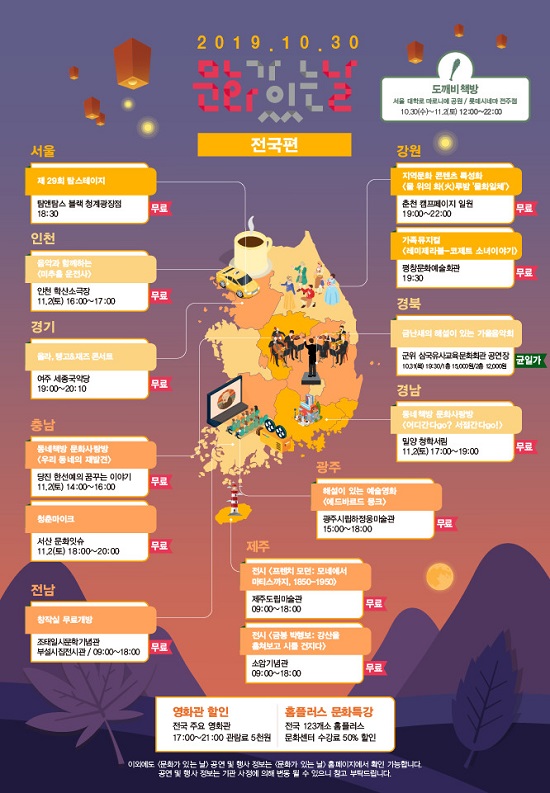 [일간환경연합 신상미 기자]30일 ‘문화가 있는 날’과 해당 주간에는 전국에서 청춘마이크, 도깨비책방 등 문화예술행사 2736개가 국민들 곁으로 찾아간다.