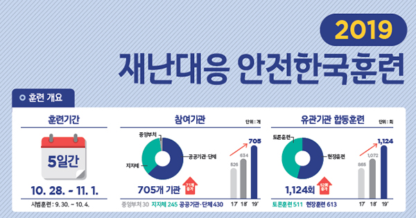 [일간환경연합 한선미 기자]행정안전부는 28일부터 11월 1일까지 5일 동안 전국에서 ‘2019 재난대응 안전한국훈련(이하 ‘안전한국훈련’)’을 일제히 실시한다.