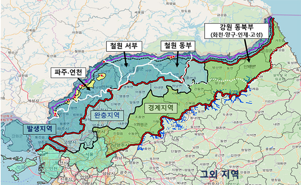 광역 울타리는 접경지역을 4개 권역으로 나눠 아프리카돼지열병이 발생한 ‘파주·연천’, ‘철원 동부’ 권역과 그 사이 ‘철원 서부’ 권역 등 3개 권역은 늦어도 올해 11월 중순까지 우선 설치할 예정이다. 이후 나머지 ‘강원 동북부(화천·양구·인제·고성)’ 권역도 설치에 들어간다.