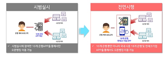금융위원회 관계자는 “오픈뱅킹 실시로 종합 금융플랫폼 출현, 핀테크 기업의 진입 확대, 금융편리성 개선 등 금융산업의 혁신과 경쟁이 크게 촉진될 것으로 기대한다”고 말했다.