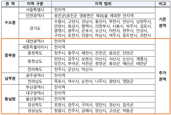 우선 2005년부터 지정된 수도권 외에 중부권, 동남권, 남부권을 권역으로 추가 설정해 총 77개의 특광역시 및 시군을 권역으로 관리한다.