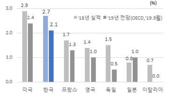 OECD가 지난 9월에 발표한 2019년 9월 중간 경제전망(Interim Economic Outlook)에서 우리나라 성장률은 올해 연간 기준 경제 수준과 규모가 유사한 3050 클럽 중 미국에 이어 2위를 기록하고 있다.
