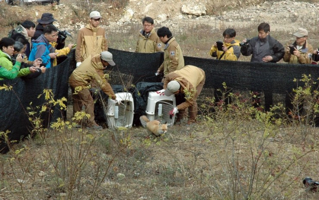토종 여우를 소백산 방사 현장.환경부와 국립공원공단은 2012년 여우복원사업을 시작하여 2020년까지 소백산 인근 지역에 50마리 이상이 서식하는 것을 목표로 하고 있다.