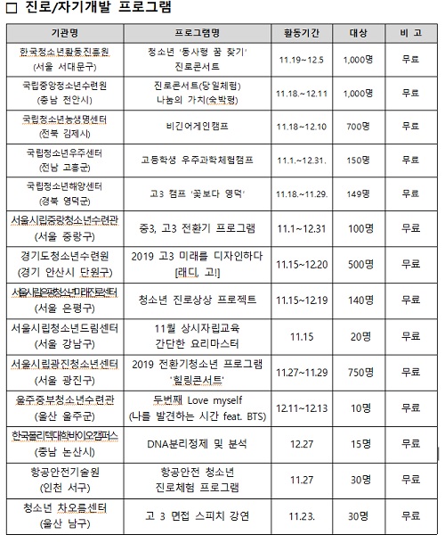 [일간환경연합 한선미 기자]대학수학능력시험을 치른 청소년들이 수능 이후 자신의 진로에 대해 설계 해 볼 수 있는 진로탐험 프로그램이 전국 곳곳에서 열린다.