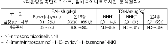 가동중단('17. 4.)된 비료공장의 가동 당시 배출을 확인하기 위한 정제유 사용업체 및 유사공정 비료제조업체 조사와 연초박 건조공정(300℃)을 모사한 모의시험 결과, 연초박의 건조과정에서 발암물질인 다환방향족탄화수소(PAHs)와 담배특이니트로사민(TSNAs)이 배출되는 사실도 확인했다.