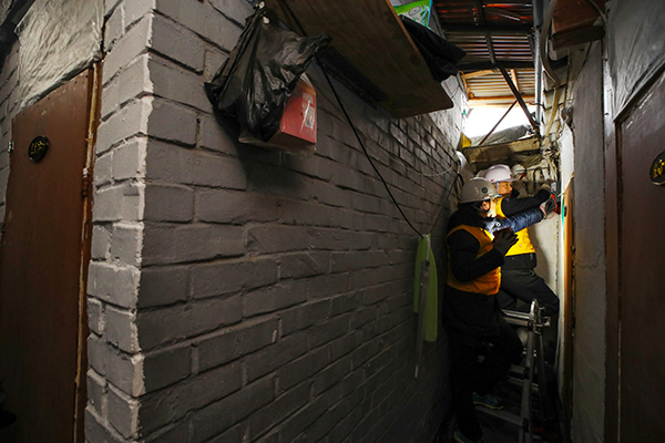 전기통신 전문가들이 재능기부 봉사로 쪽방촌의 낡은 전기시설에 대한 합선과 누전 등 전기 안전을 점검하고 있다. (사진=(c) 연합뉴스) |