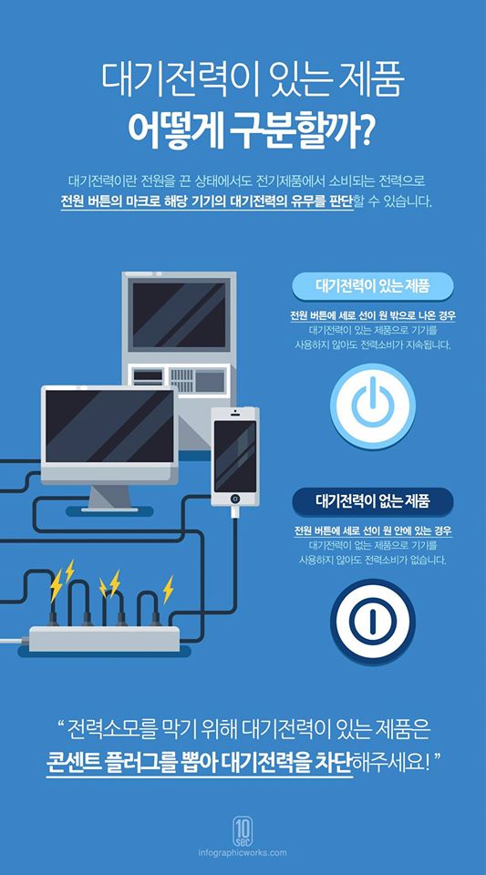 우리나라 전자제품의 대부분은 대기전력이 있는 제품으로 대표적으로 컴퓨터, TV, 에어컨, 복사기 등은 대기전력이 있으며 세탁기나 전자렌지의 경우 대기전력이 없는 경우가 많습니다. 제품마다 차이가 있기에 전원 버튼의 마크로 대기전력의 유무를 확인하신 후 가정/기업 내 불필요한 전력낭비를 줄여보는 것이 어떨까요