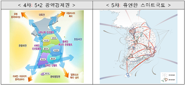 공간 전략의 경우 앞선 제4차 계획(2011∼2020년)은 ‘5+2 광역경제권’이라는 국가 주도의 하향식 공간 전략을 제시한 반면, 5차 계획에서는 국가와 지방이 협력적 관계에서 다양한 연대와 협력을 하는 ‘유연한 스마트 국토’가 제시됐다.
