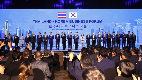 태국을 공식방문 중인 문재인 대통령이 지난 9월 2일 오후 방콕 시내 인터콘티넨탈 호텔에서 열린 한-태국 비즈니스 포럼에서 기조연설을 마치고 태국 쁘라윳 짠오차 총리 등 양국 참석자들과 기념촬영을 하고 있다. 이날 문 대통령은 기조연설을 통해 양국의 4차 산업혁명 기술 분야 협력 강화, 문화 공동체 형성, 공정한 자유무역 질서 확립을 강조했다.(사진=(c) 연합뉴스) |