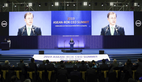 문재인 대통령이 25일 오전 부산 벡스코 2전시장에서 열린 2019 한-아세안 특별 정상회의 ‘CEO 서밋’ 행사에서 기조연설을 하고 있다. (사진=청와대) |