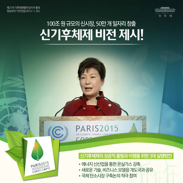 [일간환경연합 장민주 기자]제21차 기후변화협약 당사국 총회(COP21) 정상회의에서 신기후체제의 성공적 이행을 위한 세 가지 실행방안을 제안한 박근혜 대통령! 그 세 가지 방안을 정리했습니다.